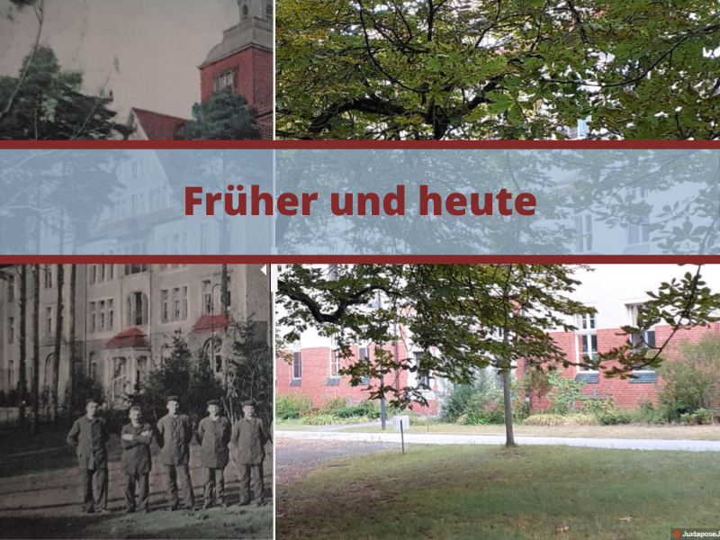 Das Bild zeigt die Sicht vom Klinikpark auf das Gebäude der heutigen Neurologischen Fachkliniken in Beelitz-Heistätten. Das linke Motiv stammt von einer Postkarte aus dem Jahr 1909. Man beachte die Gruppe von Herren,die sich damals für das Foto in Reih und Glied aufgestellt hatten. Das rechte Bild ist aktuell entstanden. Besonders an der Baumvegetation erkennt man, dass zwischen diesen beiden Aufnahmen 112 Jahre liegen.
