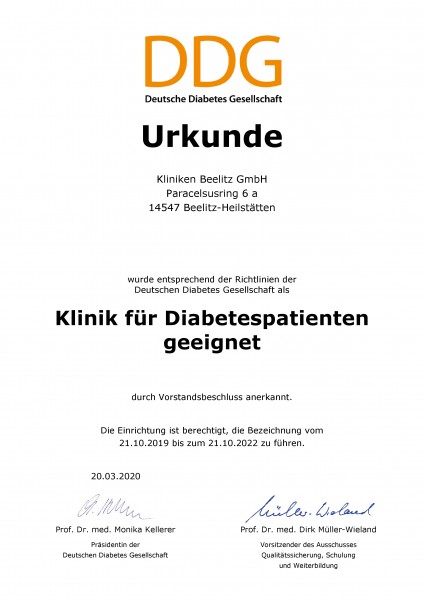 Diabetes ist die Volkskrankheit Nr. 1 in Deutschland: Über sechs Millionen Menschen sind betroffen. Daher haben Ärzte und Pfleger in Kliniken sehr oft mit Patienten zu tun, die zusätzlich zu ihrer aktuellen Erkrankung noch einen Diabetes haben. „Patienten sollten darauf achten, dass das Personal in der Klinik sich auch mit Diabetes sehr gut auskennt“, sagt DDG-Präsidentin Frau Prof. Dr. Monika Kellerer. Dafür hat die DDG das Zertifikat „Klinik für Diabetespatienten geeignet DDG“ entwickelt, welches nun die Kliniken Beelitz GmbH erhalten hat: „Die Kliniken Beelitz GmbH stellt eine fächerübergreifende Diabetes-Kompetenz sicher, von der die Patienten auf allen Stationen profitieren.“, sagt Kellerer.